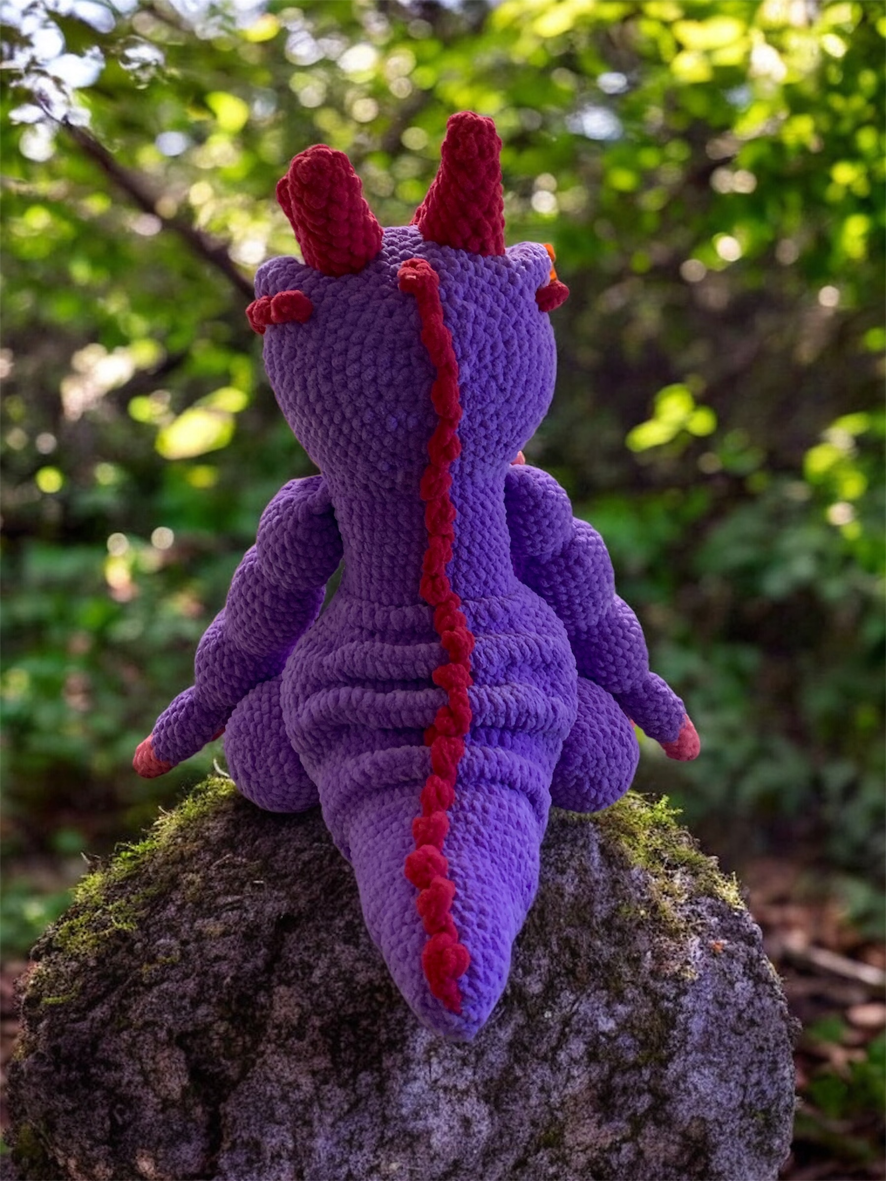 See armas lilla draakon on käsitsi heegeldatud detailitäpsusega ja sobib suurepäraselt nii mängukaaslaseks kui ka dekoratiivseks aksessuaariks. Pehme tekstuur, pikad jäsemed ja kontrastsed roosad detailid küünistel ning punased harjandid annavad talle isikupärase ja sõbraliku ilme. Sädelevad silmad lisavad mängulisust ja iseloomu.